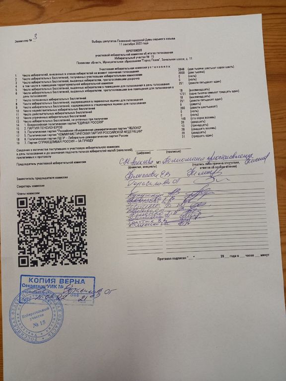На целом ряде избирательных участков Пскова наблюдателям и доверенным лицам кандидатов выдали копии итоговых протоколов с нарушениями требования закона. Например, не соответствуют требованиям копии протоколов с УИК 17, 18, 20, 30, 32, 34, 41, 42, 45, 45,47, 49, 51,, 52, 57, 58, 61, 62, 67,, 70, 73, 74, 78, 80,81,82 и др.